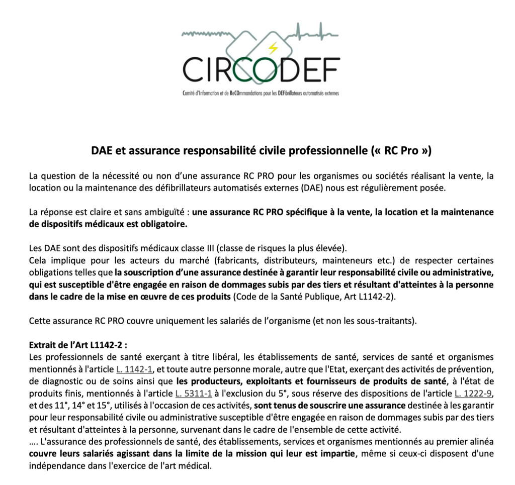 DAE et assurance responsabilité civile professionnelle (« RC Pro »)